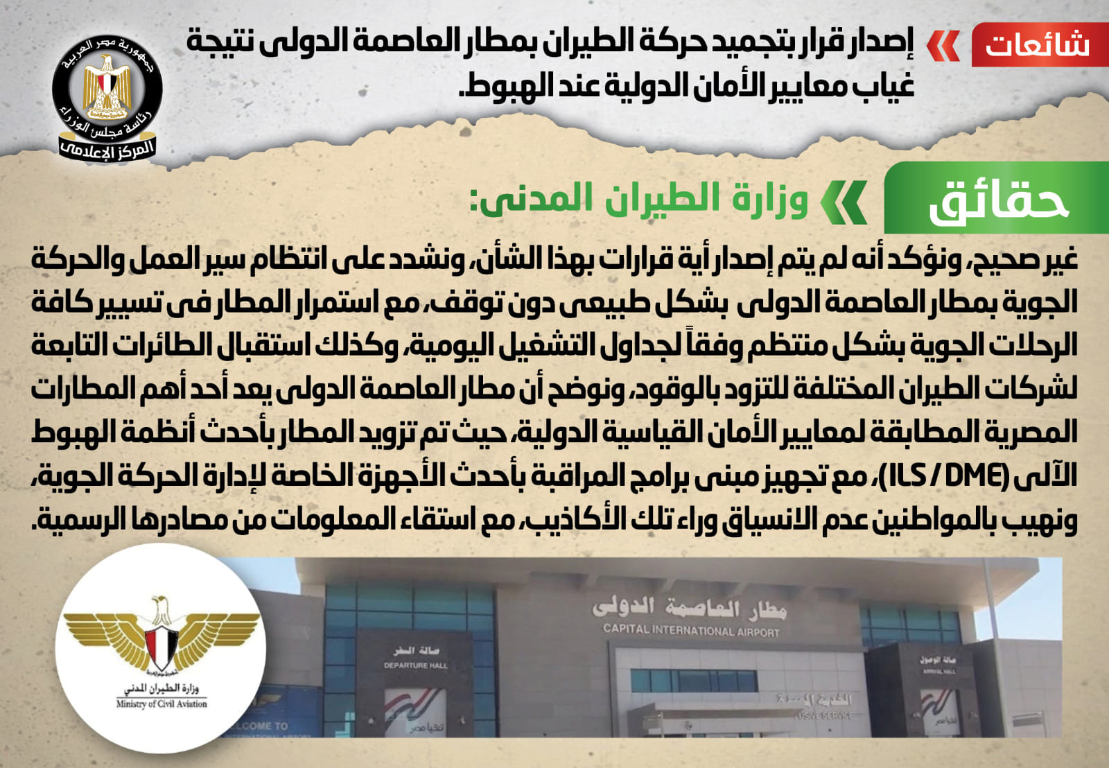 وأوضحت وزارة الطيران المدني، أن مطار العاصمة الدولي يعد أحد أهم المطارات المصرية المطابقة لمعايير الأمان القياسية الدولية، حيث تم تزويد المطار بأحدث أنظمة الهبوط الآلي (ILS / DME)، مع تجهيز مبنى برامج المراقبة بأحدث الأجهزة الخاصة لإدارة الحركة الجوية، مهيبةً بالمواطنين عدم الانسياق وراء تلك الأكاذيب، مع استقاء المعلومات من مصادرها الرسمية.