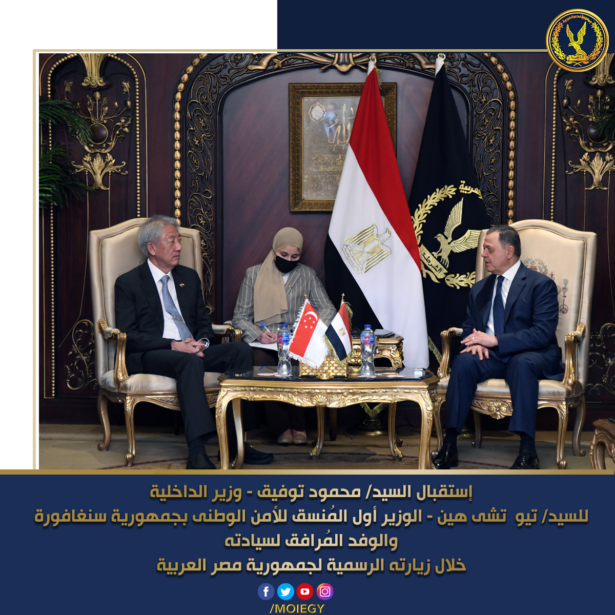 إستقبل السيد محمود توفيق وزير الداخلية ، السيد تيو تشى هين – الوزير أول المُنسق للأمن الوطنى بجمهورية #سنغافورة والوفد المُرافق لسيادته خلال زيارته الرسمية لجمهورية #مصر العربية .