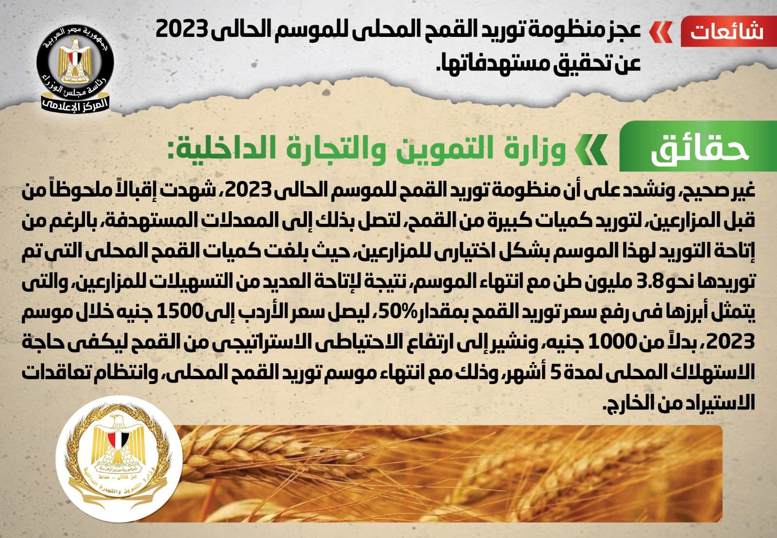 نفت الحكومة المصرية عجز منظومة توريد القمح المحلي للموسم الحالي 2023 عن تحقيق مستهدفاتها، وذلك بعد أن انتشر في بعض المواقع الإلكترونية وصفحات التواصل الاجتماعي أنباء بشأن عجز منظومة توريد القمح المحلي للموسم الحالي 2023 عن تحقيق مستهدفاتها، وقد قام المركز الإعلامي لمجلس الوزراء بالتواصل مع وزارة التموين والتجارة الداخلية، والتي نفت تلك الأنباء.