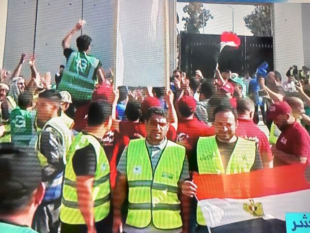 بالتزامن مع بدء عبور المساعدات من معبر رفح إلى قطع غزة، شهد المعبر تظاهرة كبيرة شارك فيها عشرات المتطوعين رافعين الأعلام المصرية وهتفوا لفلسطين