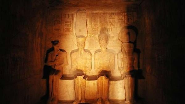 وبدأت الظاهرة بسقوط أشعة الشمس على واجهة المعبد، والتى يبلغ ارتفاعها 33 متراً وعرضها 30 متراً، وارتفاع كل تمثال من التماثيل الأربعة فى الواجهة 20 متراً، ثم تسللت أشعة الشمس داخل المعبد، وصولا أقدس الأقداس والذى يبعد عن المدخل بحوالى ستين متراً، ويتكون من منصة تضم تمثال الملك رمسيس الثانى جالسا وبجواره تمثال الإله رع حور أخته، والإله آمون، وتمثال رابع للإله بتاح، يشار إلى أن الشمس لا تتعامد على وجه تمثال “بتاح”، الذى كان يعتبره القدماء إله الظلام.