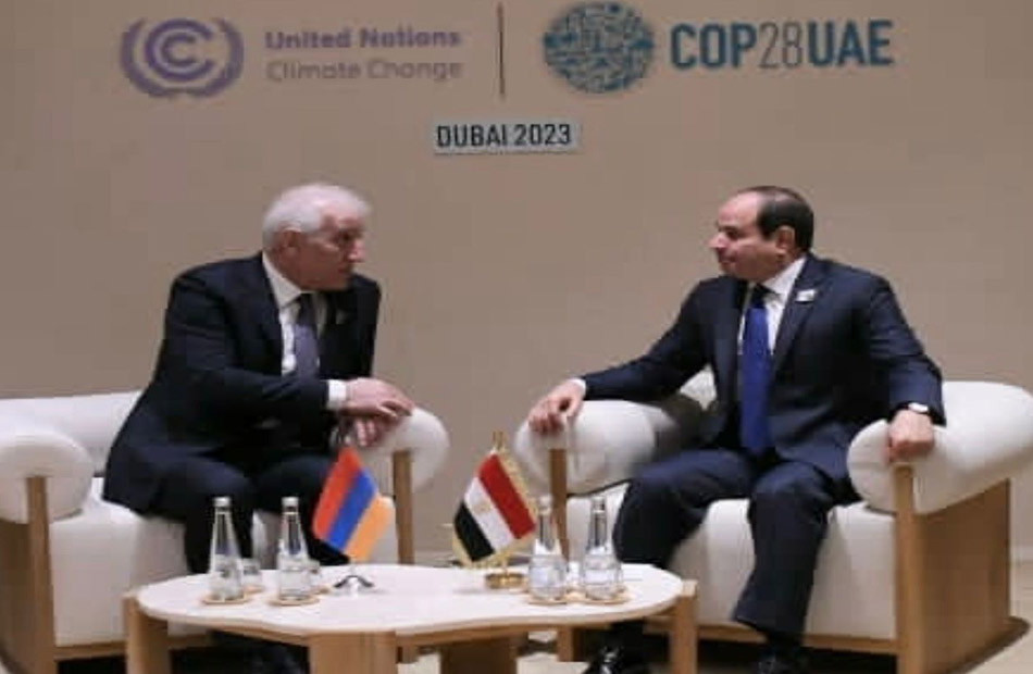 التقى الرئيس عبد الفتاح السيسي، اليوم السبت، مع الرئيس الأرميني “فاهاجن خاتشاتوريان”، وذلك على هامش انعقاد “الدورة الـ٢٨ لمؤتمر أطراف اتفاقية الأمم المُتحدة الإطارية لتغير المناخ” في دبي.