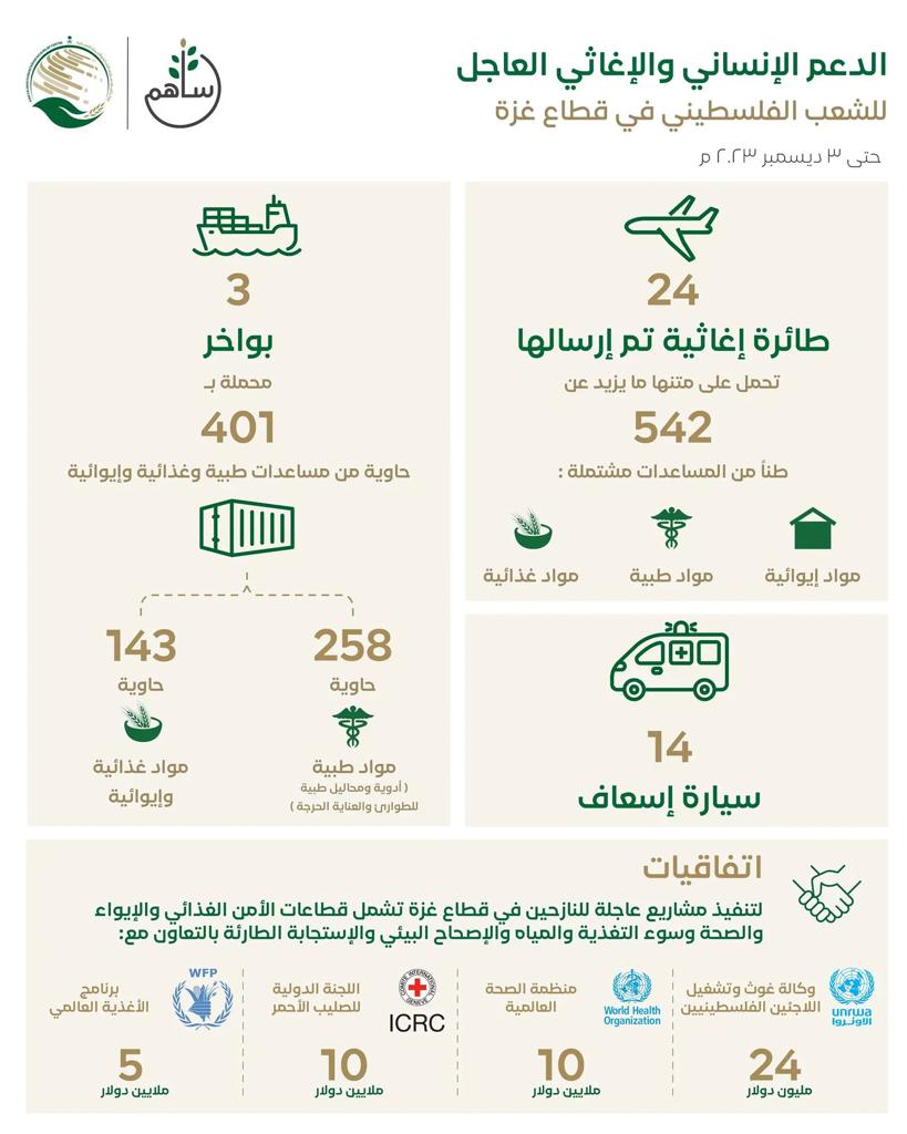 - ثلاث باخرات على متنها 401 حاوية كبيرة تم تسييرها من ميناء جدة الإسلامي إلى ميناء بورسعيد بمصر لإغاثة الشعب الفلسطيني