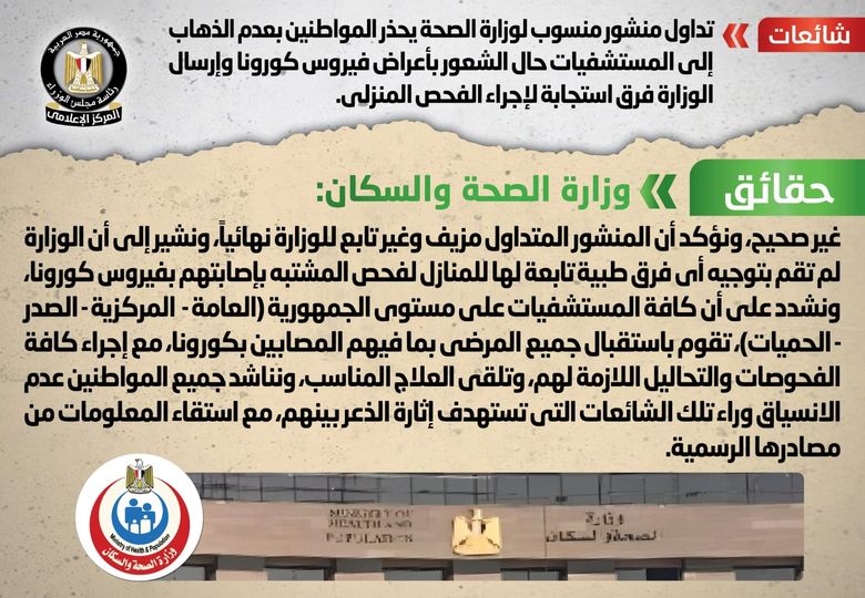 يأتي ذلك بعد أن تداولت صفحات التواصل الاجتماعي منشوراً منسوباً لوزارة الصحة يحذر المواطنين بعدم الذهاب إلى المستشفيات حال الشعور بأعراض فيروس كورونا وإرسال الوزارة فرق استجابة لإجراء الفحص المنزلي، وقد قام المركز الإعلامي لمجلس الوزراء بالتواصل مع وزارة الصحة والسكان، والتي نفت تلك الأنباء.