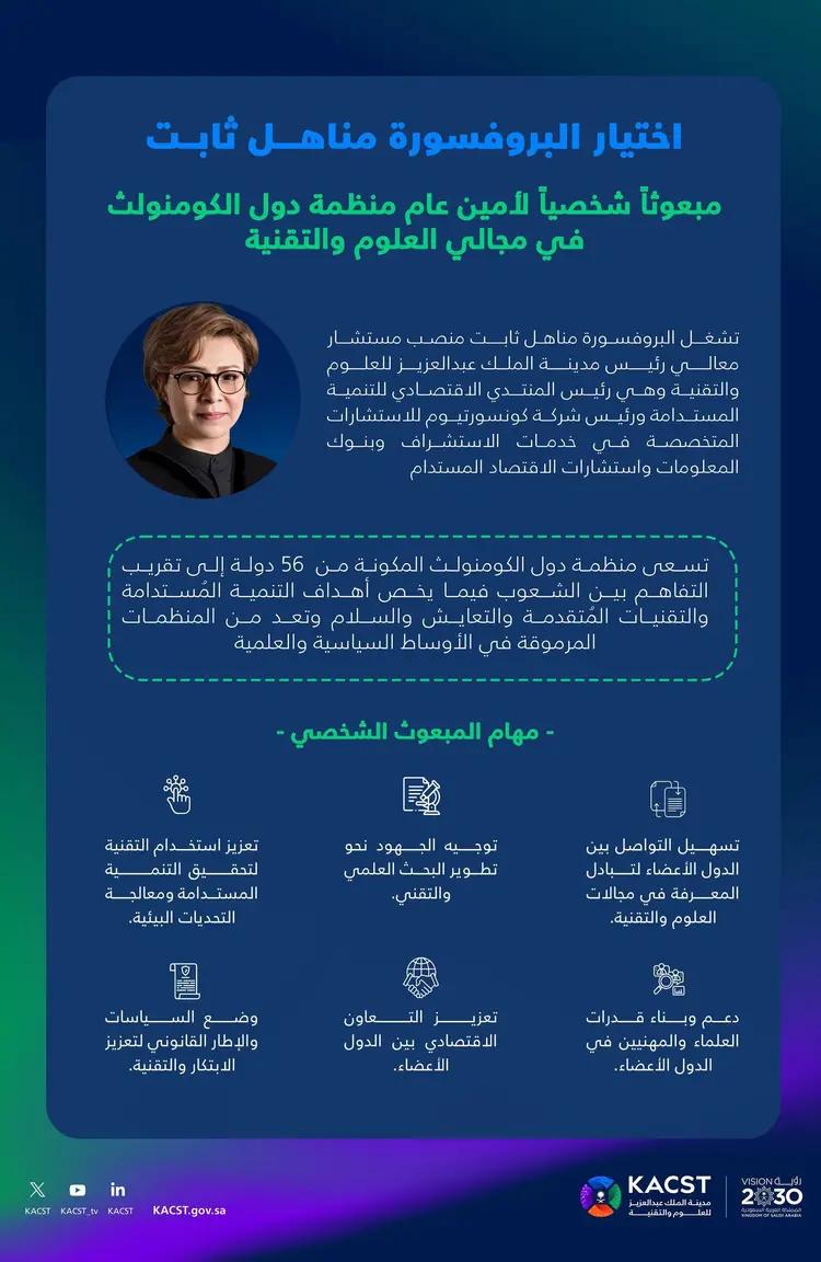 اختيار السعودية مناهل ثابت مبعوثاً شخصياً لأمين عام منظمة دول الكومنولث في مجالي العلوم والتقنية
