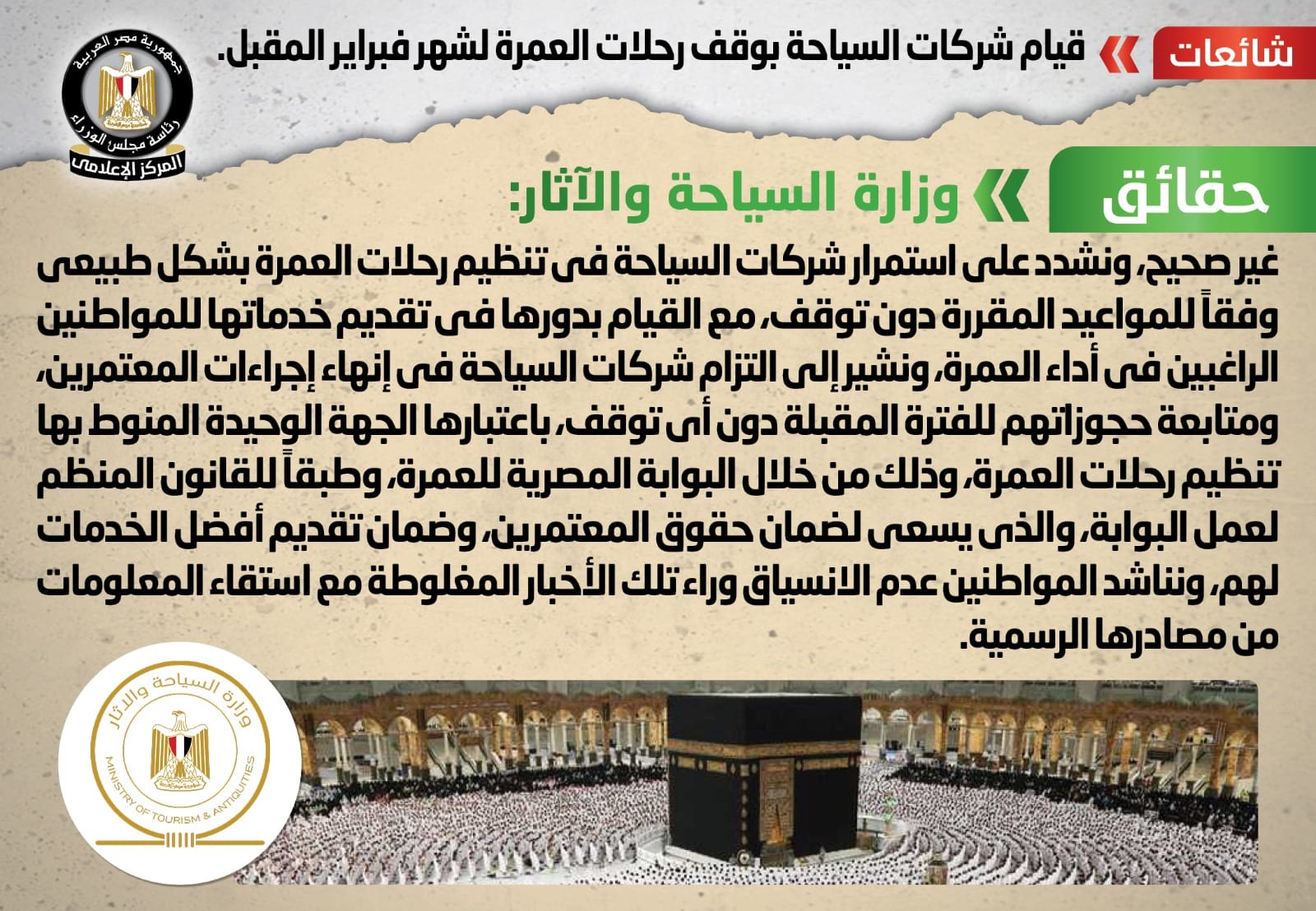 كشفت الحكومة المصرية حقيقة قيام شركات السياحة بوقف رحلات العمرة لشهر فبراير المقبل، وذلك بعد أن تداولت بعض المواقع الإلكترونية المحلية والأجنبية وصفحات التواصل الاجتماعي أنباء بشأن قيام شركات السياحة بوقف رحلات العمرة لشهر فبراير المقبل، وقد قام المركز الإعلامي لمجلس الوزراء بالتواصل مع وزارة السياحة والآثار، والتي نفت تلك الأنباء.