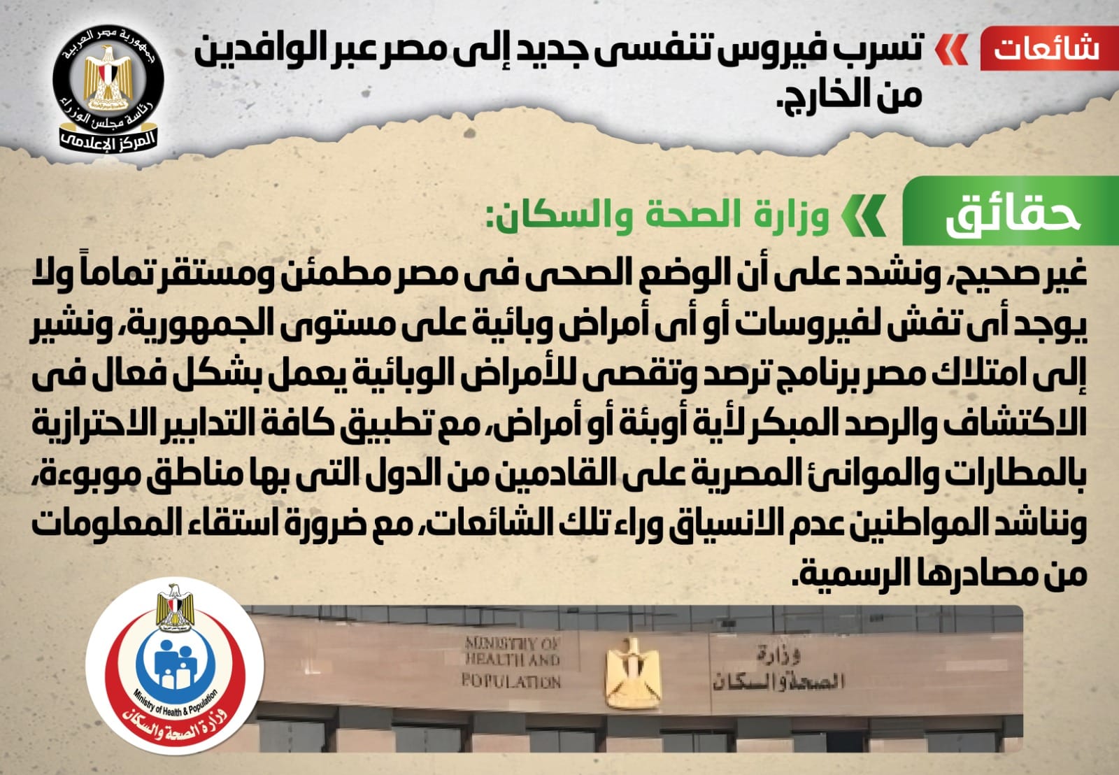 وأكدت وزارة الصحة والسكان، أنه لا صحة لتسرب فيروس تنفسي جديد إلى مصر عبر الوافدين من الخارج، مشددةً على أن الوضع الصحي في مصر مطمئن ومستقر تماماً ولا يوجد أي تفش لفيروسات أو أي أمراض وبائية على مستوى الجمهورية.