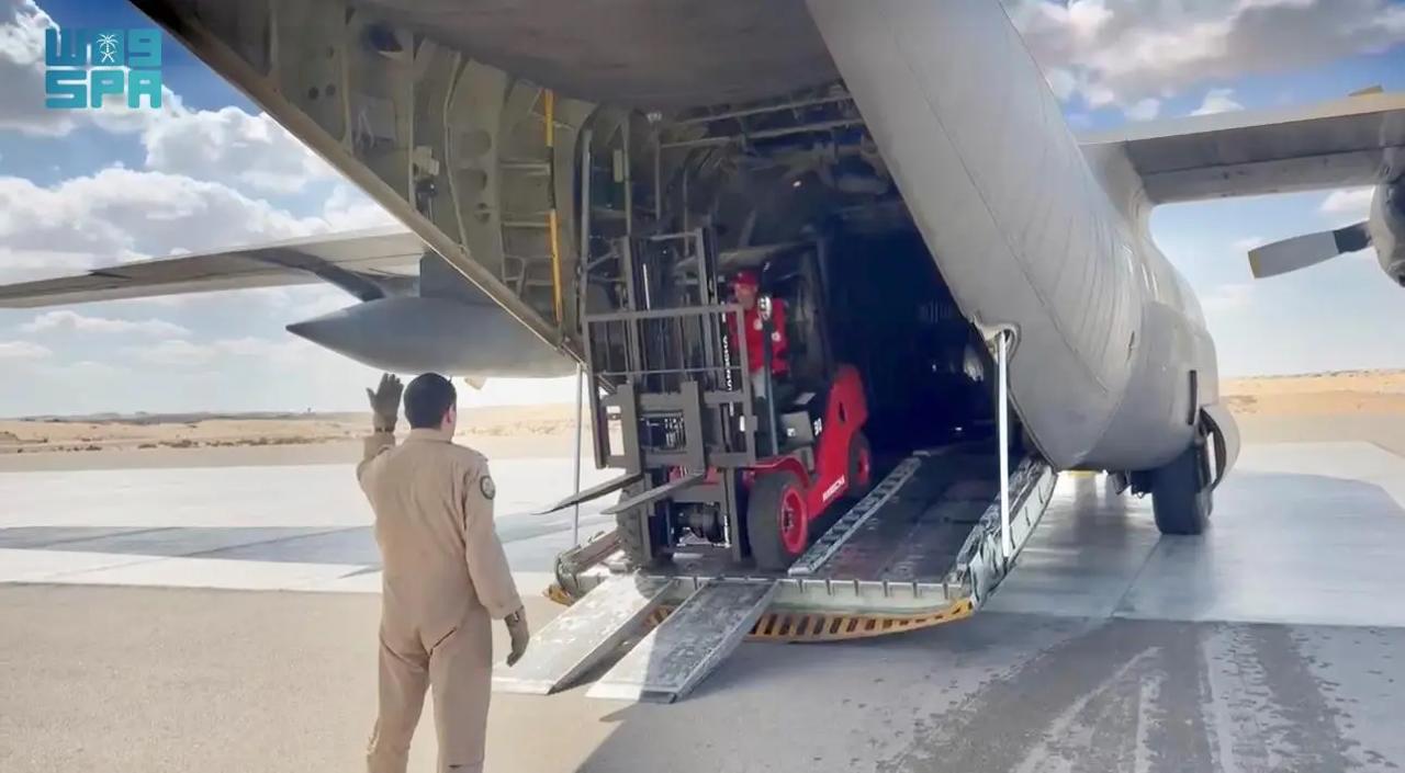 وصول الطائرتين الإغاثيتين السعوديتين 39 و40 لمدينة العريش وعلى متنهما سيارتي نقل ورافعتين شوكيتين لتسهيل نقل المواد الإغاثية للشعب الفلسطيني