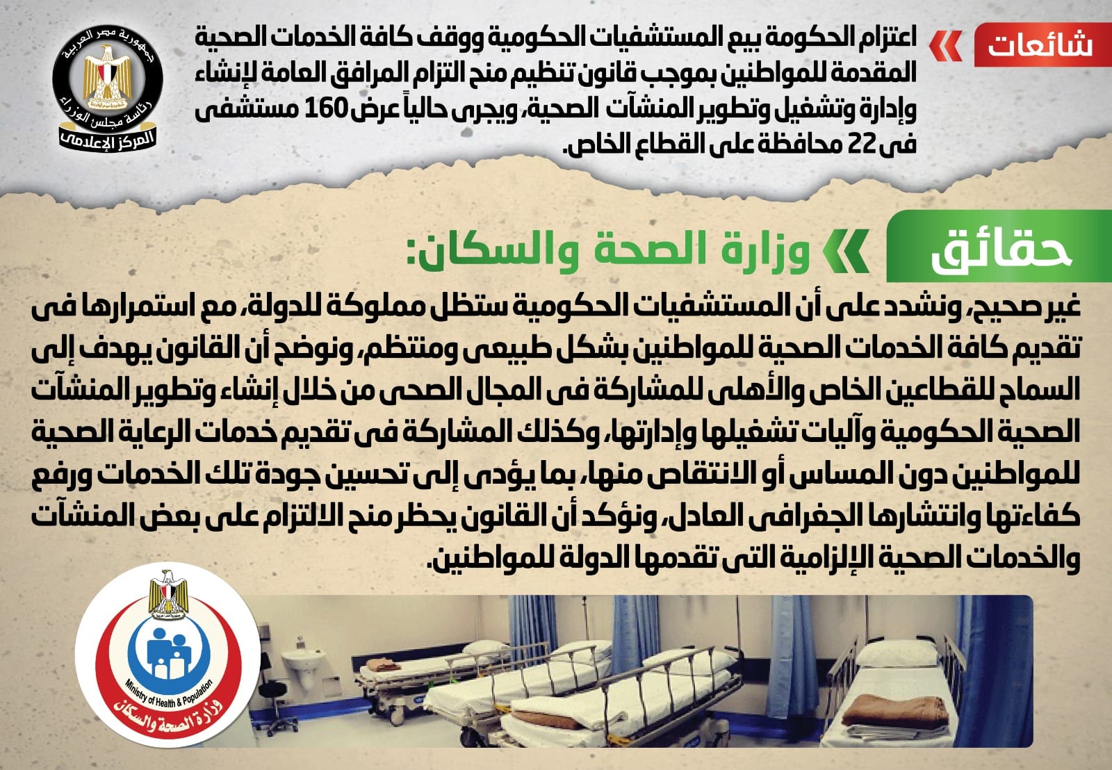 كشفت الحكومة حقيقة بيع المستشفيات الحكومية ووقف الخدمات المقدمة للمواطنين، بعد أن تداولت بعض المواقع الإلكترونية وصفحات التواصل الاجتماعي أنباء بشأن اعتزام الحكومة بيع المستشفيات الحكومية ووقف كافة الخدمات الصحية المقدمة للمواطنين بموجب قانون تنظيم منح التزام المرافق العامة لإنشاء وإدارة وتشغيل وتطوير المنشآت الصحية، ويجري حالياً عرض ١٦٠ مستشفى في ٢٢ محافظة على القطاع الخاص، وقد قام المركز الإعلامي لمجلس الوزراء بالتواصل مع وزارة الصحة والسكان، والتي نفت تلك الأنباء.