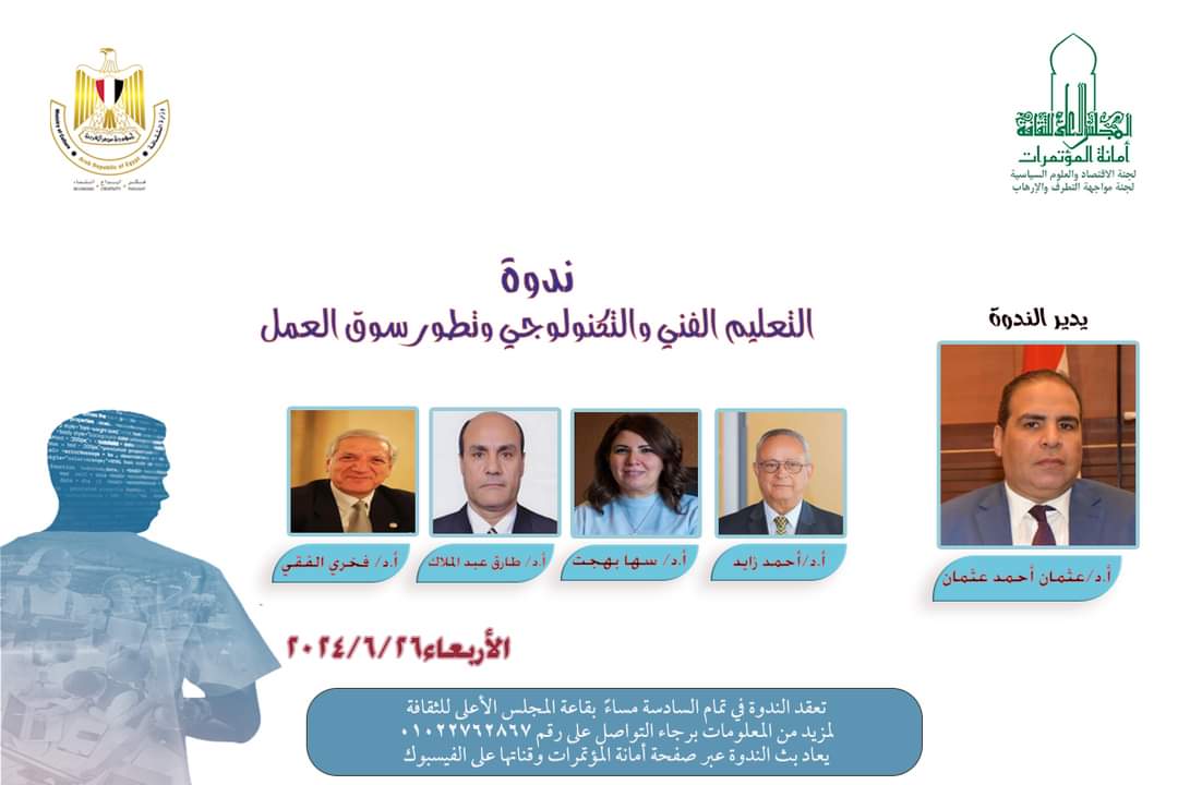 تحت رعاية الدكتورة نيفين الكيلاني وزيرة الثقافة وبأمانة الدكتور هشام عزمي، الأمين العام للمجلس الأعلى للثقافة، يتشرف بدعوة حضراتكم لحضور ومتابعة ندوة التعليم الفني والتكنولوجي وتطور سوق العمل، التي تنظمها لجنة الاقتصاد والعلوم السياسية برئاسة الدكتور محمد مرسي بالتعاون مع لجنة مواجهة التطرف والإرهاب برئاسة الدكتور أحمد زايد؛ وذلك غدا الأربعاء في تمام السادسة مساءً بالمجلس الأعلى للثقافة.