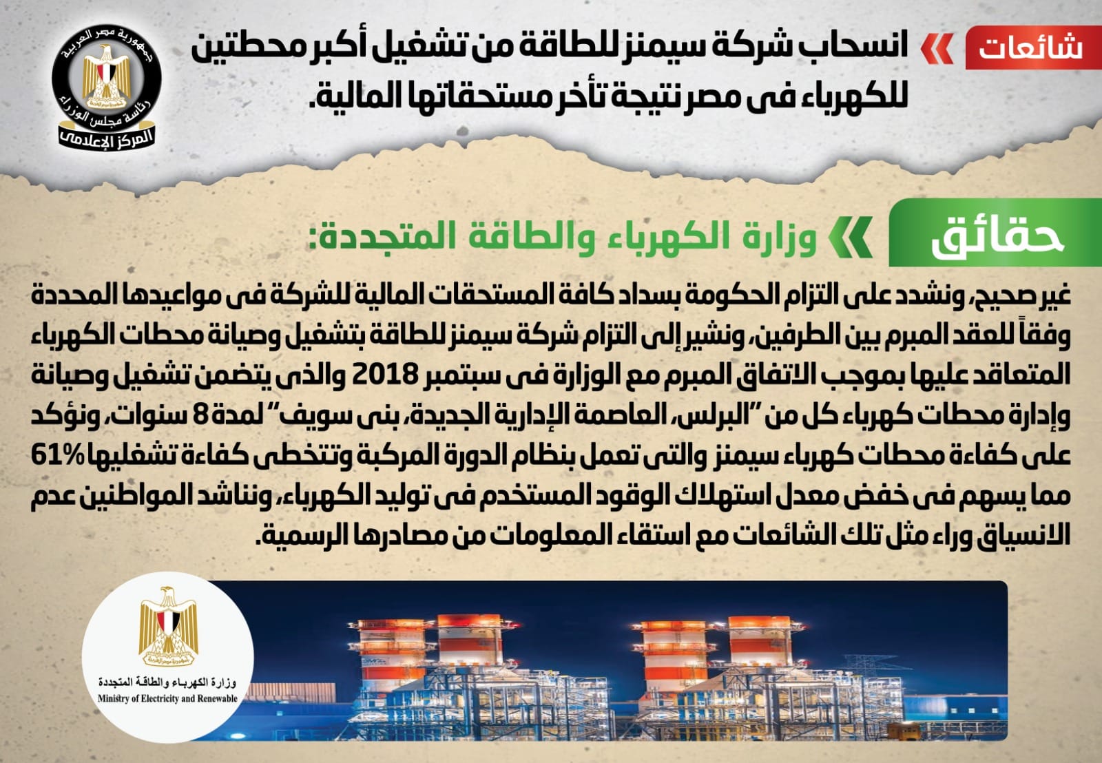 وقام المركز الإعلامي لمجلس الوزراء، بالتواصل مع وزارة الكهرباء والطاقة المتجددة، والتي نفت تلك الأنباء، مُؤكدةً أنه لا صحة لانسحاب شركة سيمنز للطاقة من تشغيل أكبر محطتين للكهرباء في مصر نتيجة تأخر مستحقاتها المالية.