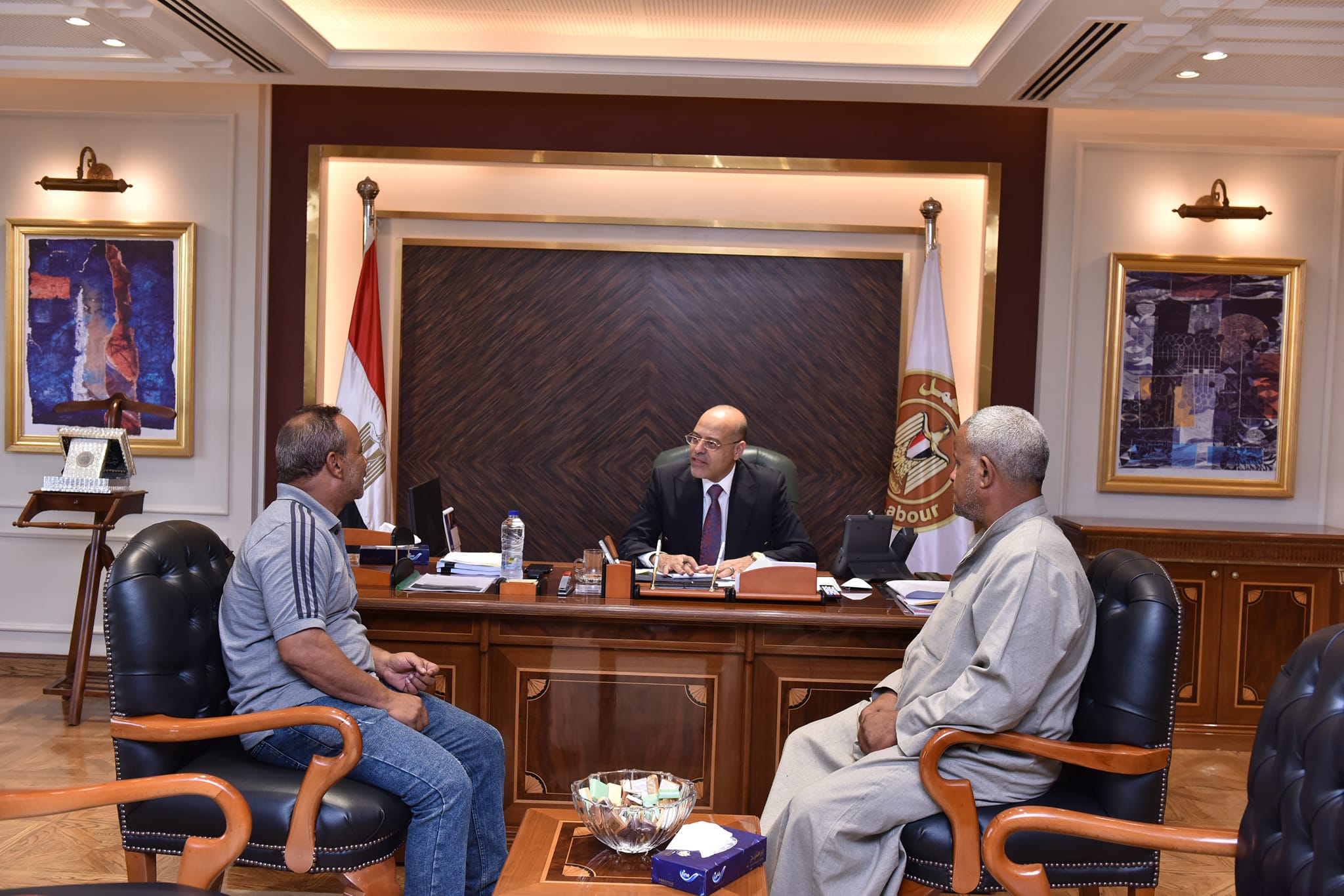 إستجاب محمد جبران وزير العمل إلى شكوى عَامِلين اثنين، من العمالة غير المنتظمة،واستقبلهما داخل مكتبه بالعاصمة الإدارية صباح اليوم الأربعاء،وقرر تنفيذ مطالبهما كافة، بضمهما لمنظومة العمالة غير المنتظمة بالوزارة ،للإستفادة من 6 منح سنوية ،ومنح خاصة ،كذلك الرعاية الصحية والطبية..قال الوزير أنه شاهد فيديو للعاملين الاثنين، على مواقع “السوشيال ميديا”،قبل توليه حقيبة الوزارة بأيام قليلة ،يطلبان فيه شمولهما بالرعاية والحماية من الحكومة ،وعندما إختارته القيادة السياسية لهذه المهمة الوطنية قام بالبحث عن وسائل التواصل معهما ،حتى حدث هذا اللقاء داخل مقر الوزارة ..وأوضح الوزير أن ثقافة “الجمهورية الجديدة”، إحترام المواطن المصري ،وتقديم الخدمات له بشكل لائق وكريم ،تنفيذًا لتوجيهات السيد الرئيس عبدالفتاح السيسي رئيس الجمهورية ،وتوجهات الحكومة الجديدة برئاسة دولة رئيس مجلس الوزراء د. مصطفى مدبولي “..وقال أيضًا أنه وجه كافة المديريات ،والإدارات المُختصة بتكثيف الجهود للتوسع في قاعدة بيانات العمالة غير المنتظمة،ووصول الدعم والحماية والرعاية للمستحقين ،موضحًا أن ذلك إهتمام مباشر من السيد الرئيس السيسي..