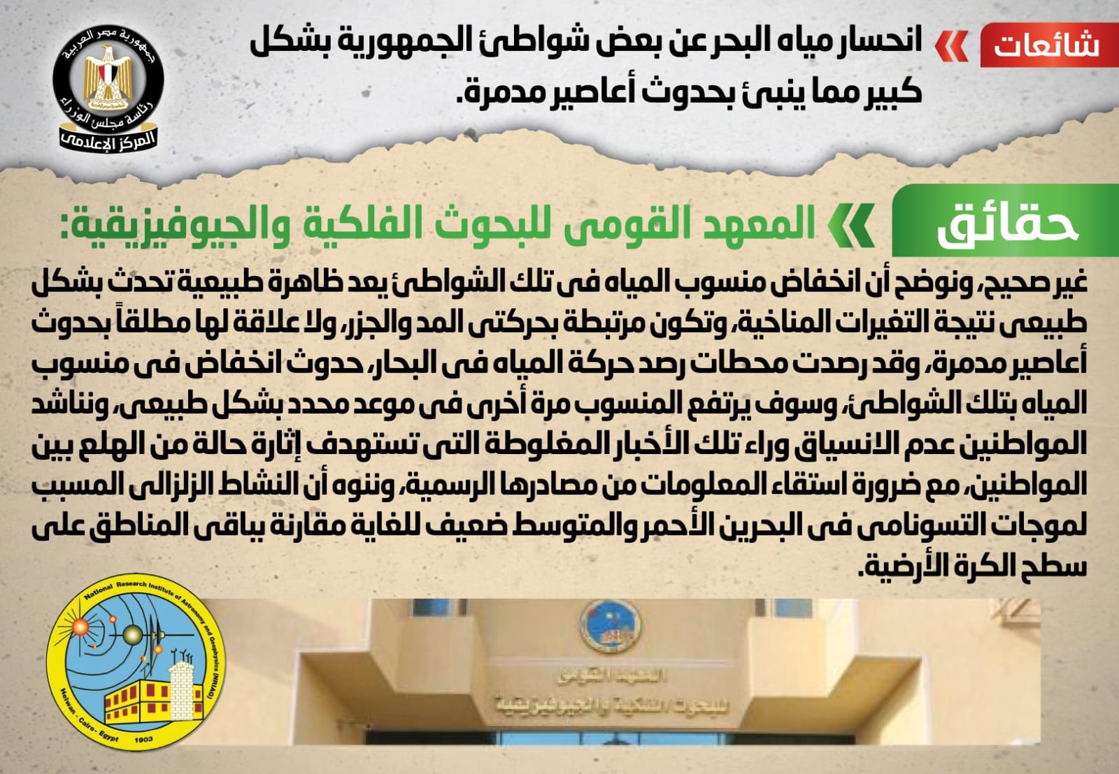 انتشر في بعض صفحات التواصل الاجتماعي أنباء بشأن انحسار مياه البحر عن بعض شواطئ الجمهورية بشكل كبير مما ينبئ بحدوث أعاصير مدمرة، وقد قام المركز الإعلامي لمجلس الوزراء بالتواصل مع المعهد القومي للبحوث الفلكية والجيوفيزيقية، والذي نفى تلك الأنباء.