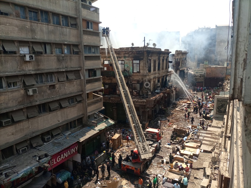 وقال شاهد عيان، صاحب محل تجاري في سوق العتبة: “يوم الخميس الساعة الحادية عشرة والنصف مساء حدث ماس كهربائي في العمارة وهي منشأة قديمة بنيت في بداية القرن التاسع عشر وبها 25 محلا تجاريا بالدور الأرضي، و25 مكتبا بالدور الأول”.