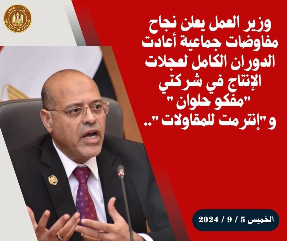 أعلن محمد جبران وزير العمل ،اليوم الخميس عن عودة العمل بكامل طاقته داخل شركتي مفكو حلوان لصناعة الأثاث ،وإنترمت للمقاولات التي تعمل في نطاق شركة أسمنت بورتلاند..