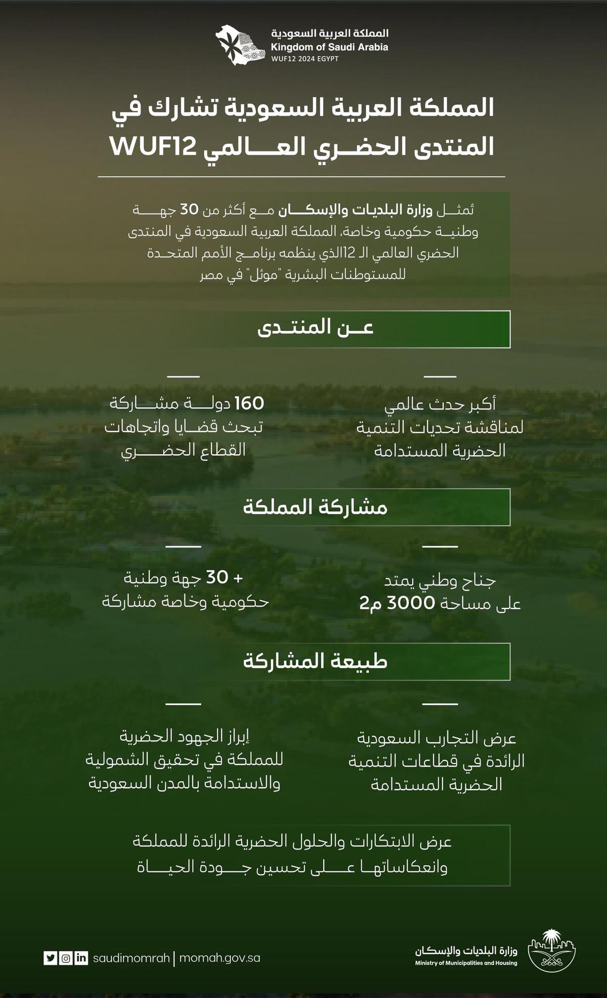 وتشارك المملكة بجناح تقوده وزارة البلديات والإسكان وبمشاركة أكثر من 30 جهة وطنية حكومية وخاصة، بهدف إبراز دور المملكة الريادي في تحقيق المستهدفات العالمية للتنمية الحضرية المستدامة ومشاركتها في صياغة المشهد الحضري الإقليمي والعالمي، وذلك من خلال استعراض تجاربها ومشاريعها ومبادراتها وابتكاراتها وحلولها الرائدة في تحويل المدن السعودية إلى مجتمعات حضرية شاملة ومرنة ومستدامة بما يتماشى مع أهداف رؤية المملكة 2030.