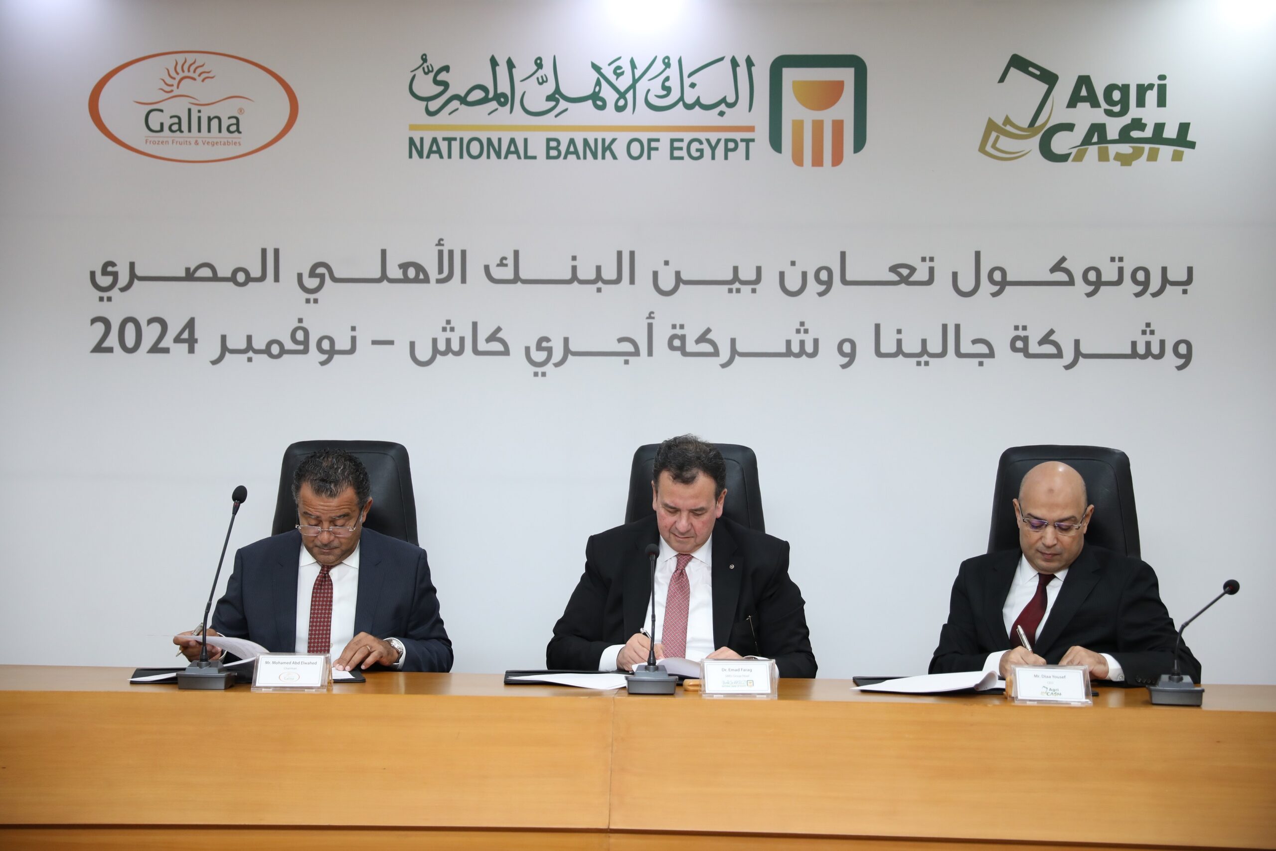 وقع البروتوكول عماد فرج رئيس مجموعة المشروعات الصغيرة والمتوسطة بالبنك الاهليالمصري ومحمد عبد الواحد سليمان نائب رئيس مجلس الإدارة بشركة جالينا وضياء يوسف المدير التنفيذي بشركة اجري كاش لتكنولوجيا المعلومات بحضور فرق العمل من الجانبين.