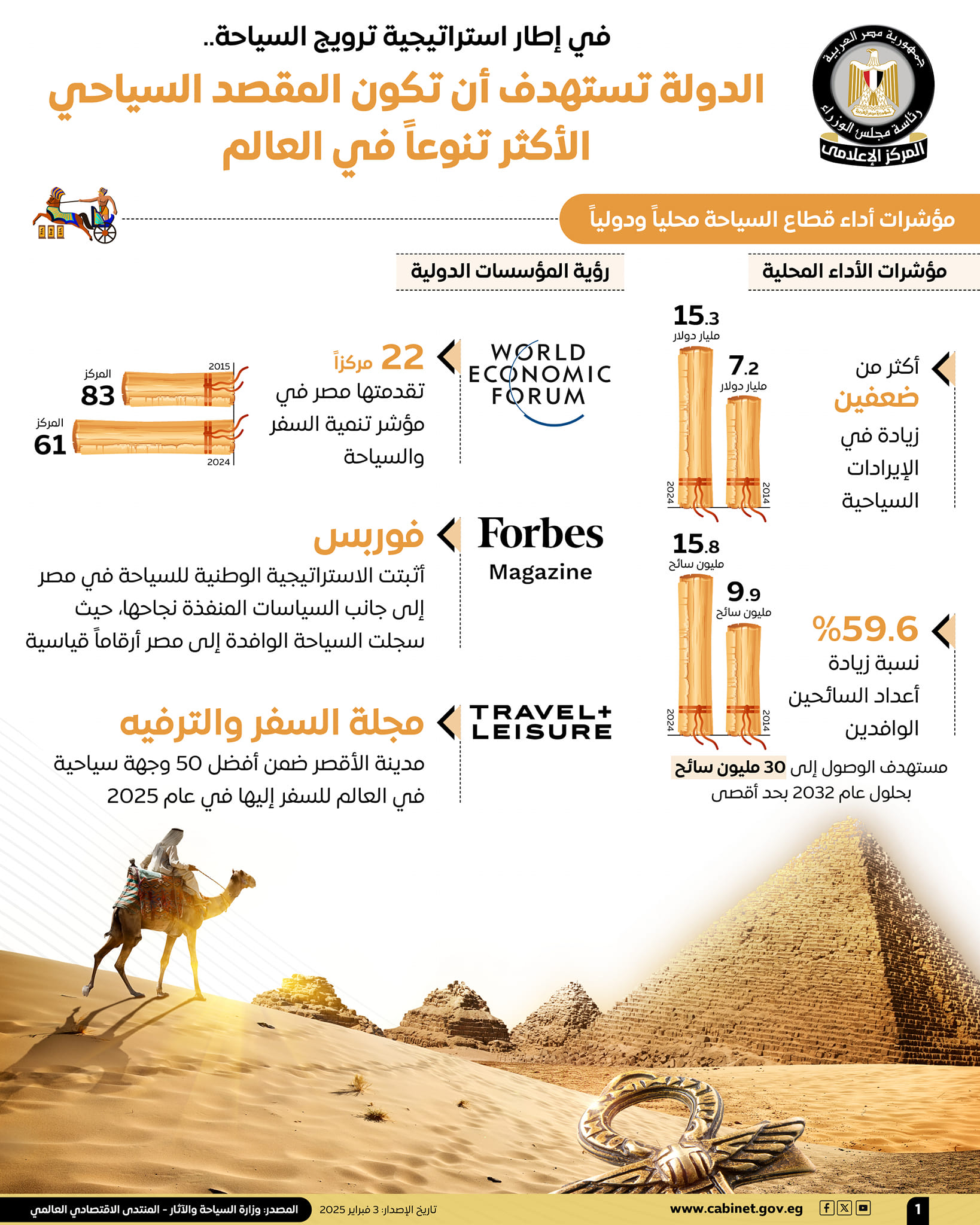 إدراكًا من الدولة المصرية لأهمية قطاع السياحة ودوره المحوري كإحدى الركائز الأساسية لدعم الاقتصاد الوطني، عكفت الدولة على تنفيذ الاستراتيجية الوطنية لتنمية السياحة، لتعظيم الاستفادة من ذلك القطاع الواعد الذي يتمتع بإمكانات هائلة، وفي هذا الإطار، حرصت الدولة على تعزيز قدرتها التنافسية على الساحة الدولية وإبراز مقوماتها السياحية والأثرية الفريدة، التي تجعلها من أكثر الوجهات تنوعًا في العالم، فضلاً عن توسيع نطاق الحملات الترويجية والفعاليات العالمية لاستهداف أسواق سياحية جديدة، كما أولت اهتمامًا خاصًا بتحسين مناخ الاستثمار السياحي، من خلال دعم الشراكة مع القطاع الخاص، والشراكات الدولية وتقديم حوافز استثمارية من شأنها تعزيز جاذبية الاستثمار في هذا المجال، وقد لاقت هذه الجهود إشادة واسعة من المؤسسات الدولية، مما انعكس إيجابيًا على تحسن تصنيف مصر في المؤشرات السياحية العالمية، ورسخ مكانتها كوجهة سياحية رائدة على مستوى العالم.