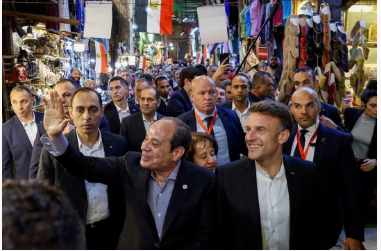 وتناول الرئيس السيسي، ونظيره الفرنسي الطعام داخل أحد المطاعم القدمية والتراثية في خان الخليلي في مشهد غير مسبوق. وظهرت السعادة على وجه الرئيس الفرنسي، الذي أبدى انبهاره بالحضارة المصرية.