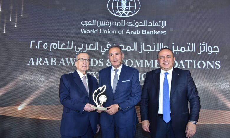 تسلم الجائزة محمد الإتربي الرئيس التنفيذي للبنك خلال الحفل الذي نظمه الاتحاد الدولي للمصرفيين العرب ببيروت ، بحضور السفير المصري في لبنان.