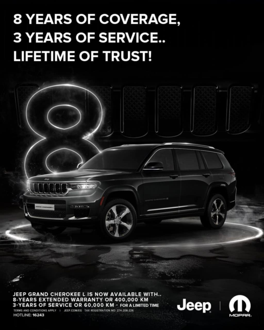 چيب®️ جراند شيروكي إل… ثقة بلا حدود وراحة بال مضمونة….. أستمتع الان بصيانة مجانية لمدة 3 سنوات أو 60 ألف كيلومتر، وضمان ممتد لمدة 8 سنوات أو حتى 400 ألف كيلومتر