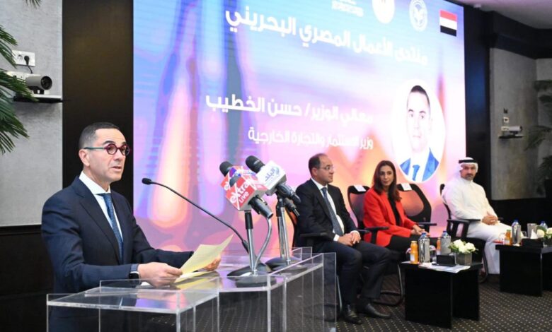 افتتح المهندس حسن الخطيب، وزير الاستثمار والتجارة الخارجية، فعاليات منتدى الأعمال المصري البحريني، حيث رحّب الوزير بممثلي مملكة البحرين الشقيقة من قيادات حكومية ورجال أعمال ومؤسسات استثمارية في هذا المنتدى الاستثماري الهام، الذي يحظى بحضور رفيع المستوى من كلا البلدين الشقيقين، بما يعكس عمق العلاقات الثنائية وما تتميز به من خصوصية وشراكة استراتيجية.