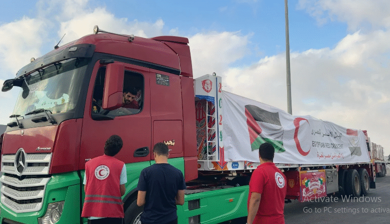 ويتواجد الهلال الأحمر المصري كآلية وطنية لتنسيق وتفويج المساعدات إلى غزة، على الحدود منذ بدء الأزمة حيث لم يتم غلق معبر رفح من الجانب المصري نهائيًا، وواصل تأهبه فى كافة المراكز اللوجستية وجهوده المتواصلة لدخول المساعدات التي بلغت أكثر من نصف مليون طن من المساعدات الإنسانية والإغاثة، وذلك بجهود 35 ألف متطوع بالجمعية.