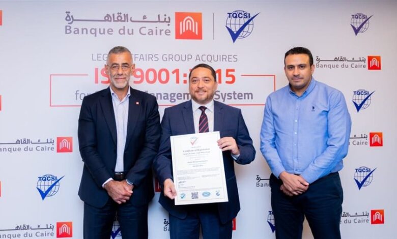 أعلن بنك القاهرة، عن حصول مجموعة الشئون القانونية بالبنك على شهادة الأيزو ISO 9001:2015 في نظام إدارة الجودة، والممنوحة من شركة TQCSI International Pty Ltd، إحدى الجهات العالمية المعتمدة في مجال منح شهادات الجودة.