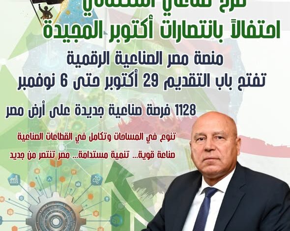 وزارة الصناعة تجدد الدعوة للمستثمرين للتقديم على 1128 قطعة أرض صناعية مرفقة مطروحة من الوزارة بمناسبة ذكرى انتصارات أكتوبر المجيدة