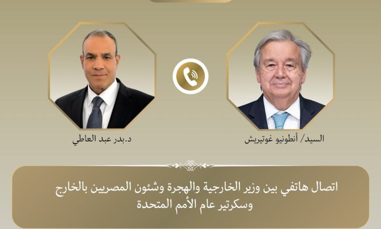 تلقى د. بدر عبد العاطي، وزير الخارجية والهجرة وشئون المصريين بالخارج يوم الخميس ١١ ديسمبر اتصالًا هاتفيا من السيد انطونيو جوتيريش، السكرتير العام للأمم المتحدة، حيث بحث الجانبان تطورات الأوضاع في الأراضي الفلسطينية المحتلة والجهود الدولية المبذولة لدعم مسار التهدئة وتثبيت وقف اطلاق النار فى غزة وتحقيق التهدئة فى الضفة الغربية.