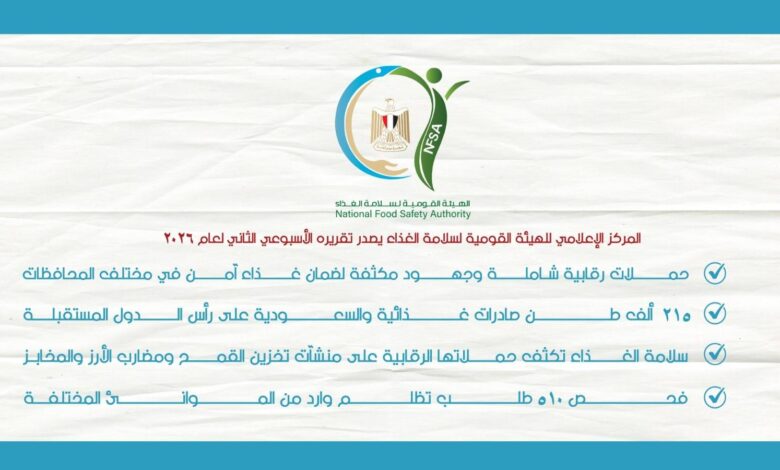 المركز الإعلامي للهيئة القومية لسلامة الغذاء يصدر تقريره الأسبوعي الثاني لعام 2026