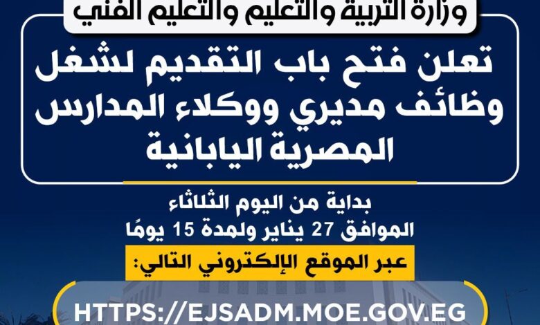 وتؤكد الوزارة أن التقديم لوظائف مدير مدرسة ووكيل مدرسة يستهدف استقطاب قيادات تربوية مؤهلة تمتلك الخبرة والكفاءة الإدارية، والقدرة على قيادة بيئة تعليمية حديثة تدعم الابتكار وتحقق مستهدفات نموذج المدارس المصرية اليابانية.