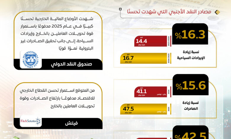 ويأتي ذلك بفضل التعافي القوي في مصادر النقد الأجنبي، والتي حققت تحسنًا ملحوظًا بعدما زادت الإيرادات السياحية بنسبة 16.3%، لتصل إلى نحو 16.7 مليار دولار عام 2024/2025، مقابل نحو 14.4 مليار دولار عام 2023/2024، فضلًا عن زيادة الصادرات (وفقًا لبيانات الجهاز المركزي للتعبئة العامة والإحصاء) بنسبة 15.6%، لتصل إلى نحو 47.5 مليار دولار خلال الفترة من يناير إلى نوفمبر 2025، مقابل نحو 41.1 مليار دولار خلال الفترة ذاتها من عام 2024.