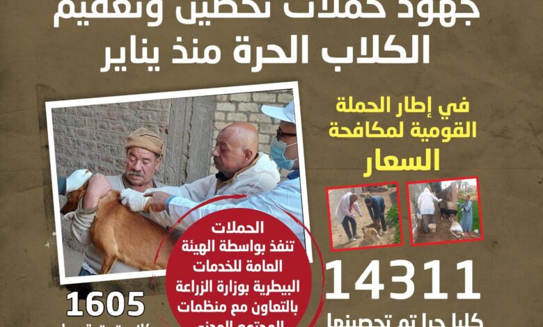 تواصل وزارة الزراعة واستصلاح الأراضي، ممثلة في الهيئة العامة للخدمات البيطرية، بالتعاون مع منظمات المجتمع المدني، تنفيذ الحملة القومية لمكافحة السعار والسيطرة على أعداد الكلاب الحرة بوسائل رحيمة وعلمية.