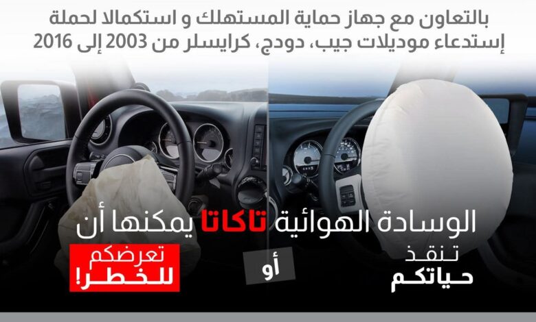 سيارات جيب وكرايسلر .. ناشد جهاز حماية المستهلك جميع مالكي السيارات من العلامات جيب (Jeep) – كرايسلر (Chrysler) من موديلات 2003 وحتى 2016 سرعة التوجه إلى مراكز الخدمة المعتمدة على مستوى الجمهورية لإجراء التغيير المجاني للوسائد الهوائية (Airbags)، بالإضافة إلى تغيير الزيت وفلتر الزيت مجانًا، وذلك دون تحمّل المستهلكين لأي رسوم أو تكاليف إضافية لوجود عيب تصنيعي بالوسائد الهوائية “تاكاتا – Takata” قد يُشكل خطورة على قائدي السيارات ويؤدي إلى إصابات بالغة أو الوفاة .