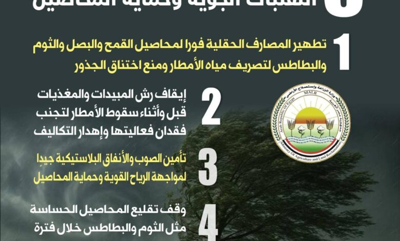 البدء الفوري بتطهير المصارف الحقلية لمحاصيل: القمح، البصل، الثوم، والبطاطس، لضمان تصريف مياه الأمطار ومنع “اختناق الجذور”.