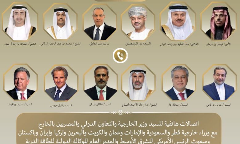 بتوجيهات من فخامة الرئيس عبد الفتاح السيسي، جرت اتصالات هاتفية مكثفة بين د. بدر عبد العاطي وزير الخارجية والتعاون الدولي والمصريين بالخارج، وكل من السيد ستيف ويتكوف المبعوث الأمريكي الخاص للشرق الأوسط، والأمير فيصل بن فرحان وزير خارجية المملكة العربية السعودية الشقيقة، والشيخ عبد الله بن زايد نائب رئيس الوزراء ووزير خارجية دولة الإمارات الشقيقة، والشيخ محمد بن عبد الرحمن آل ثاني رئيس مجلس الوزراء وزير الخارجية بدولة قطر الشقيقة، والشيخ جراح جابر الأحمد الصباح وزير خارجية دولة الكويت الشقيقة، والدكتور عبد اللطيف بن راشد الزياني وزير خارجية مملكة البحرين الشقيقة، والسيد هاكان فيدان وزير خارجية الجمهورية التركية، والسيد محمد إسحاق دار نائب رئيس الوزراء وزير خارجية باكستان، والسيد عباس عراقجي وزير خارجية إيران، والسيد رفائيل جروسى المدير العام للوكالة الدولية للطاقة الذرية، مساء يوم السبت ٤ إبريل, وذلك في إطار الجهود الحثيثة المبذولة لخفض التصعيد العسكري بالمنطقة، خاصة مع قرب انتهاء المهلة اللي منحها الرئيس الامريكى دونالد ترامب لتلقي الرد علي المقترح الأمريكي.