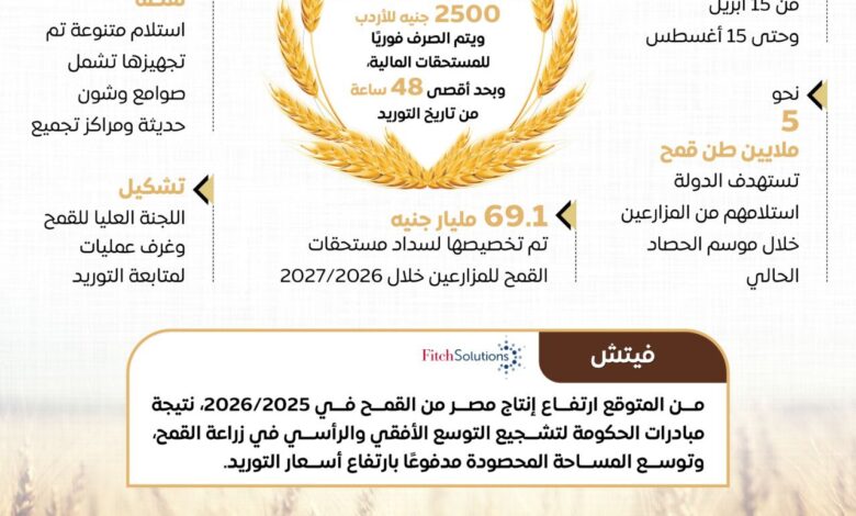 وبشأن صرف المستحقات، أكد الإنفوجراف أنه سيتم الصرف الفوري للمستحقات المالية للموردين والمزارعين، وبحد أقصى 48 ساعة من تاريخ التوريد، بما يدعم زيادة معدلات التوريد والإنتاج، إضافة إلى تشكيل اللجنة العليا للقمح وغرف عمليات مركزية وفرعية لمتابعة التوريد، لضمان انتظام منظومة التوريد والتعامل الفوري مع أي معوقات.