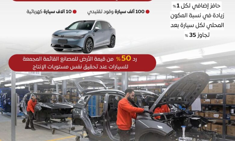 واستعرض الإنفوجراف، الحوافز التي يقدمها البرنامج، حيث يتم منح حافز إضافي بقيمة 5000 جنيه عن كل زيادة بنسبة 1% في المكون المحلي لكل سيارة تتجاوز 35%، كما يتضمن البرنامج رد قيمة الأرض بنسبة 100% للمصانع الجديدة المجمعة للسيارات في المناطق ذات الأولوية، عند تجاوز الإنتاج 100 ألف سيارة وقود تقليدي، و10 آلاف سيارة كهربائية، إضافة إلى رد 50% من قيمة الأرض للمصانع القائمة المجمعة للسيارات عند تحقيق نفس مستويات الإنتاج.