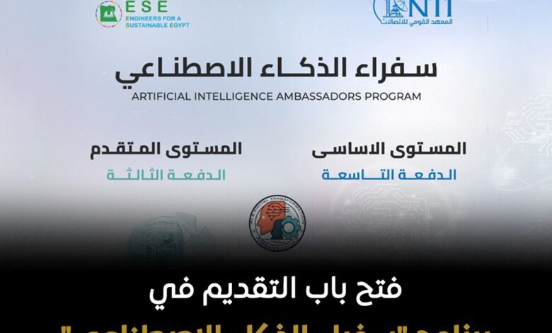 يعلن المعهد القومي للاتصالات، بالتعاون مع مؤسسة مهندسون من أجل مصر المستدامة، عن فتح باب التقديم في برنامج “سفراء الذكاء الاصطناعي”، والذي يهدف إلى تأهيل غير المتخصصين لاستخدام تقنيات الذكاء الاصطناعي في بيئات العمل المختلفة. ويُقدم التدريب مجانًا بالكامل عبر الإنترنت.