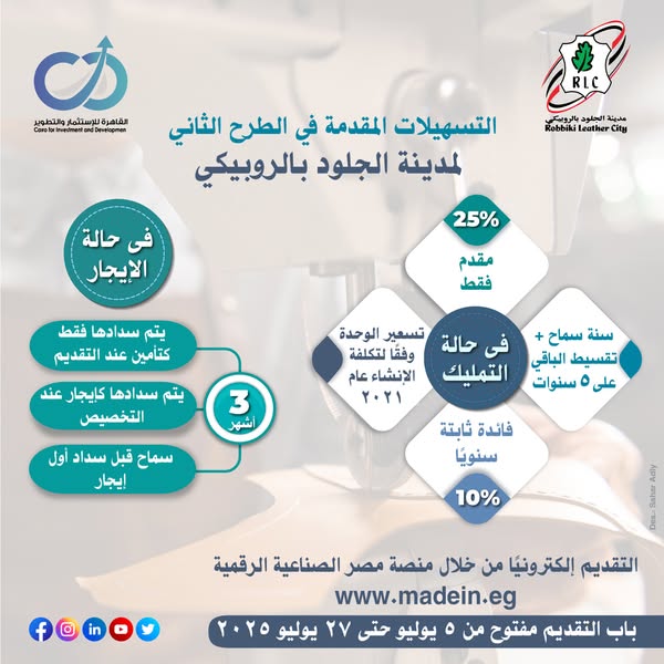 وزارة الصناعة: “القاهرة للاستثمار والتطوير” تواصل تلقي طلبات المستثمرين ضمن الطرح الثاني بمدينة الجلود بالروبيكي على 36 مصنعًا جديدًا كامل التجهيزات لإنتاج المصنوعات الجلدية تامة الصنع