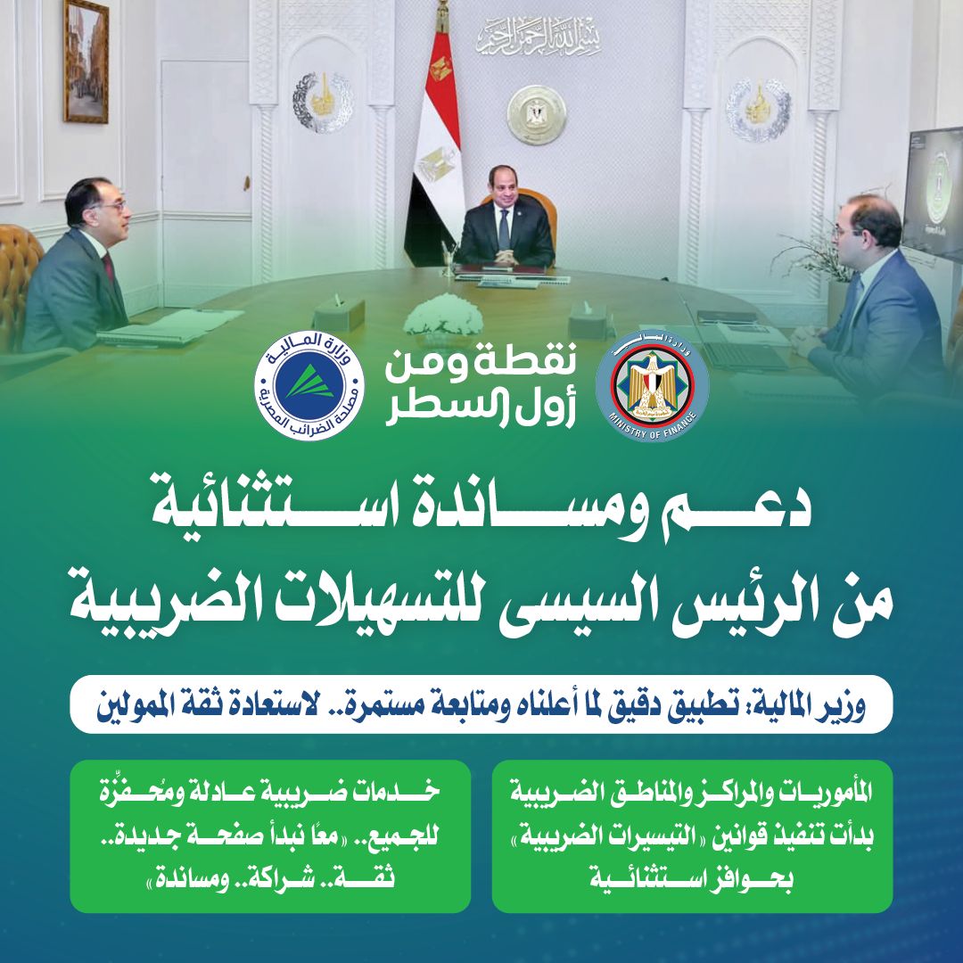 دعم ومساندة استثنائية من الرئيس السيسي للتسهيلات الضريبية.. وزير المالية: تطبيق دقيق لما أعلناه ومتابعة مستمرة لاستعادة ثقة الممولين 📌 المأموريات…