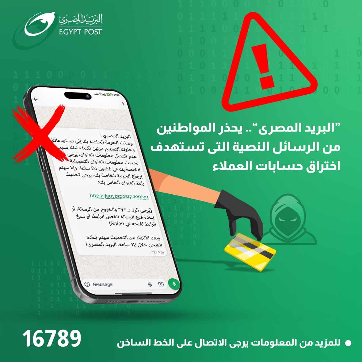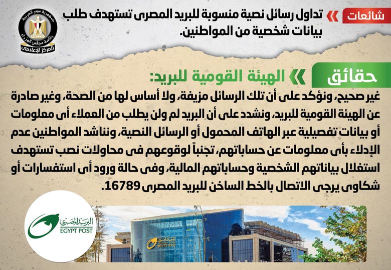 البريد المصري يحذر من الرسائل النصية والروابط غير معلومة المصدر.. التي تستهدف اختراق حسابات المواطنين