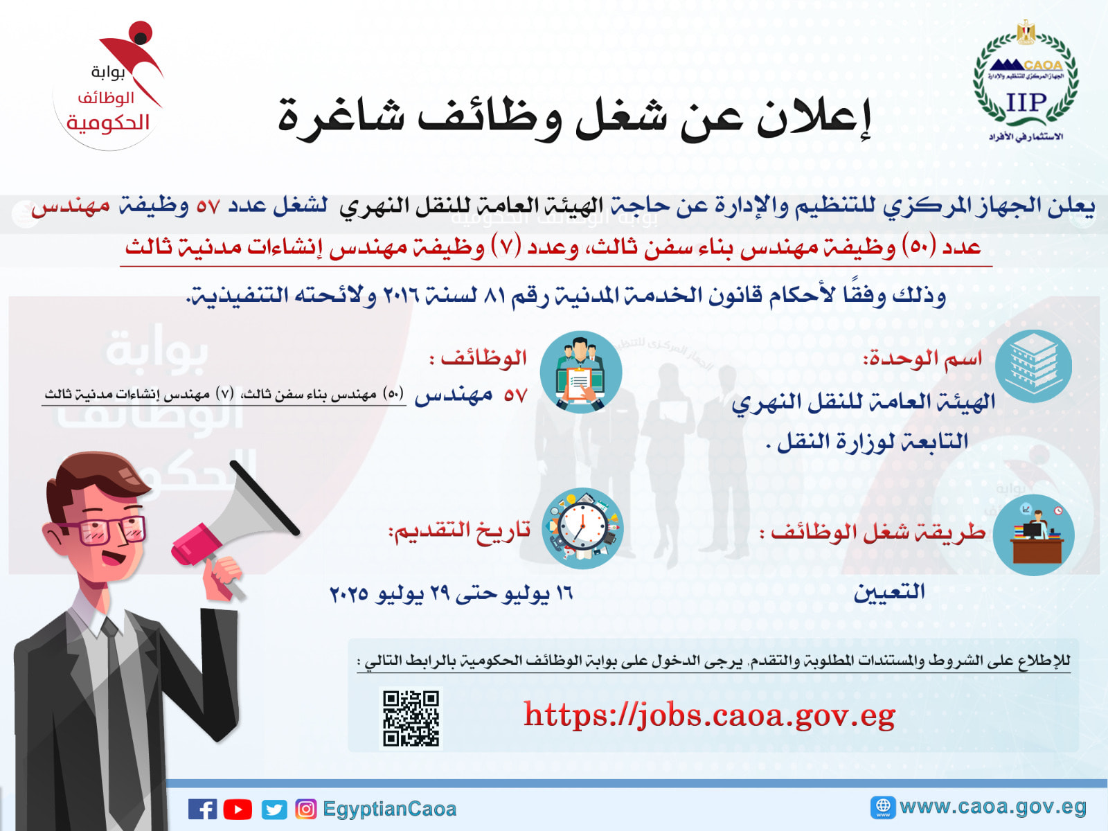 التنظيم والإدارة يعلن عن حاجـة “النقل النهري” لتعيين ٥٧ مهندسًا