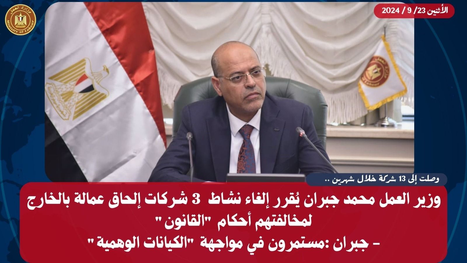 وصلت إلى 13 شركة خلال شهرين ..جبران :مستمرون في مواجهة “الكيانات الوهمية”.. قرر محمد جبران، وزير العمل،اليوم الاثنين إلغاء نشاط…