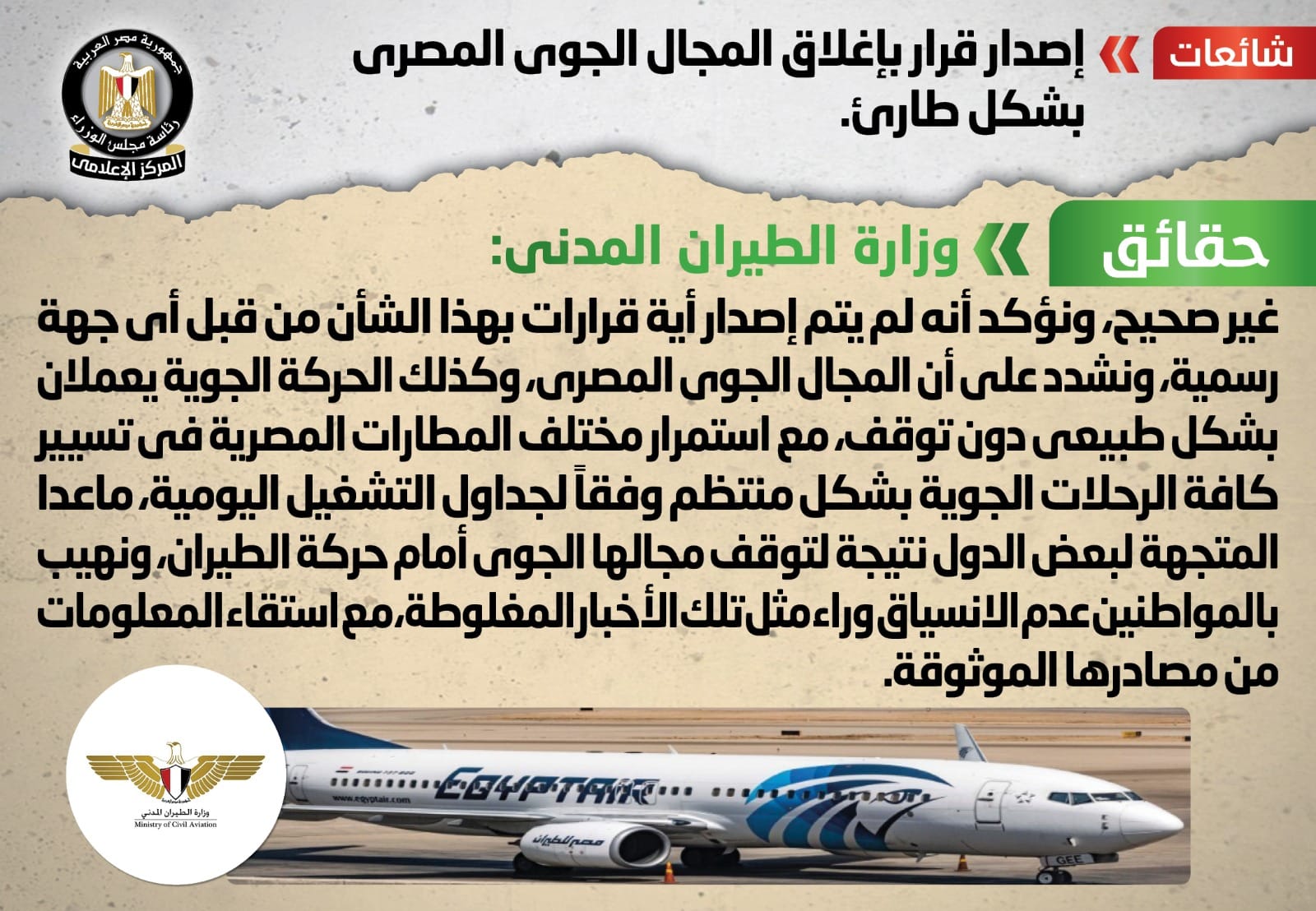 الحكومة تكشف حقيقية إصدار قرار بإغلاق المجال الجوي المصري بشكل طارئ