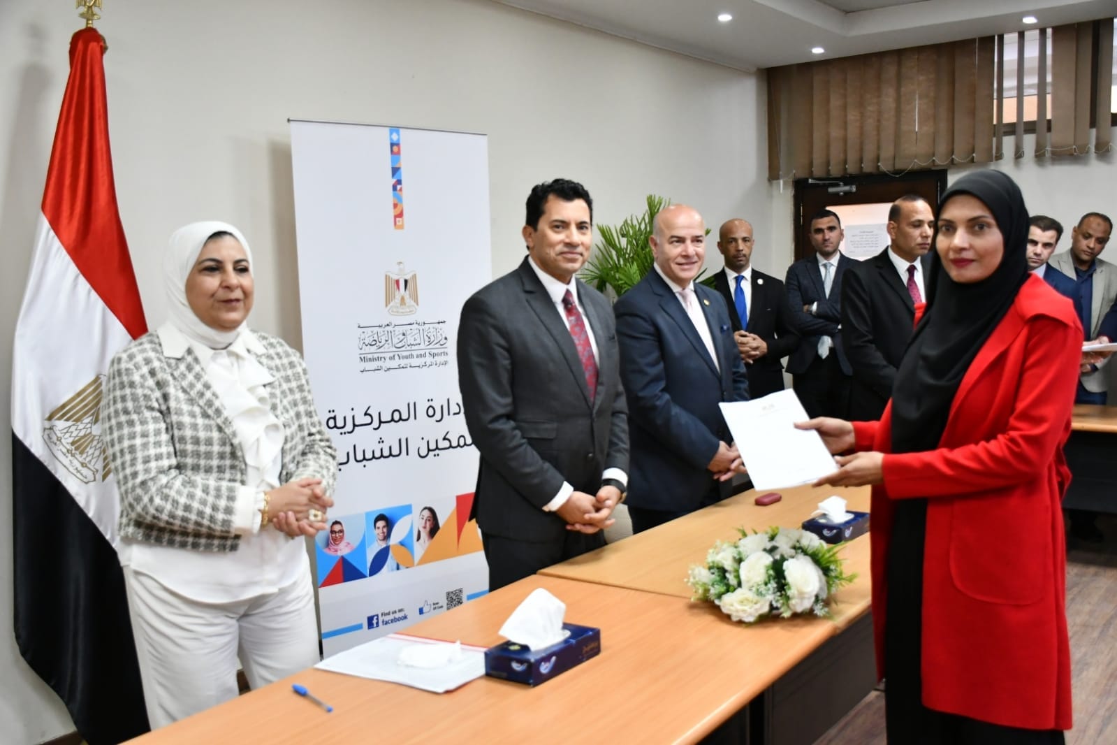 وزير الشباب والرياضة يسلم المنح المالية المقدمة من منظمة confejes لتمويل المشروعات الصغيرة للشباب