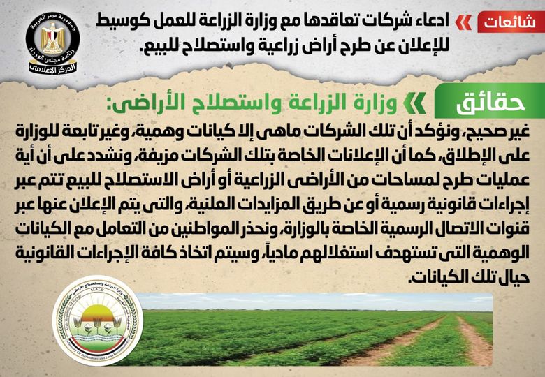 «الزراعة» تحذر المواطنين من إعلانات وهمية لبيع الأراضي